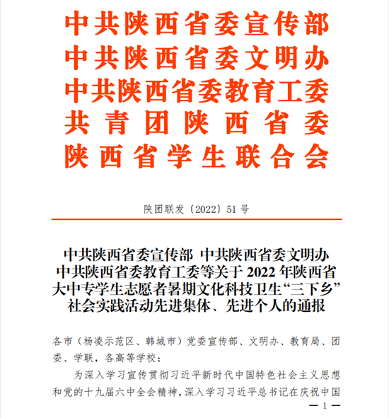 近日,中共陕西省委宣传部、中共陕西省委文明办、中共陕西省委教育工委、共青团陕西省委、陕西省学生联合会共同下发《关于2022年陕西省大中专学生志愿者暑期文化科技卫生“三下乡”社会实践活动先进集体、先进个人的通报》(陕团联发〔2022〕51号)文件,其中: