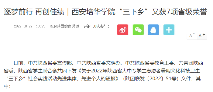 西安培华学院荣获2022年陕西省大中专学生志愿者暑期文化科技卫生“三下乡”社会实践活动“省级示范学校”荣誉称号。