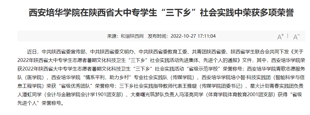 近日,中共陕西省委宣传部、中共陕西省委文明办、中共陕西省委教育工委、共青团陕西省委、陕西省学生联合会共同下发《关于2022年陕西省大中专学生志愿者暑期文化科技卫生“三下乡”社会实践活动先进集体、先进个人的通报》文件,其中,西安培华学院荣获2022年陕西省大中专学生志愿者暑期文化科技卫生“三下乡”社会实践活动“省级示范学校”荣誉称号;西安培华学院青歌志愿服务队(医学院)、西安培华学院“情系平利,助力乡村”专业社会实践队(传媒学院)、西安培华学院培小智·科技实践团(智能科学与信息工程学院)荣获“省级优秀团队”荣誉称号;三下乡社会实践指导教师代表王雅璇(传媒学院团委书记)、星火计划青春实践团负责人潘虹同学(会计与金融学院会计学1901团支部)、大秦曙光筑梦队负责人冯泽亮同学(体育学院体育教育2001团支部)获得“省级先进个人”荣誉称号。