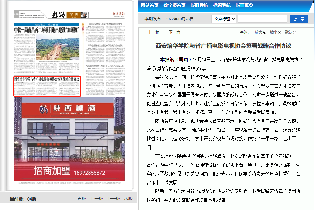 10月19日上午,西安培华学院与陕西省广播电影电视协会举行战略合作签约暨揭牌仪式。