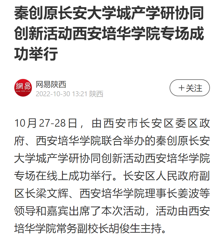 10月27-28日,由西安市长安区委区政府、西安培华学院联合举办的秦创原长安大学城产学研协同创新活动西安培华学院专场在线上成功举行。长安区人民政府副区长梁文辉、西安培华学院理事长姜波等领导和嘉宾出席了本次活动,活动由西安培华学院常务副校长胡俊生主持。