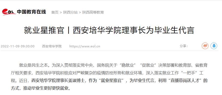 就业是民生之本。为深入贯彻落实党中央、国务院关于“稳就业”“促就业”决策部署和教育部、省教育厅相关要求,西安培华学院积极应对严峻复杂的疫情防控形势和就业环境,深入落实就业工作“一把手”工程。近日,西安培华学院理事长姜波博士,作为“就业星推官”,为毕业生代言,利用“直播带岗送人才”的方式,推动毕业生更好更快就业。