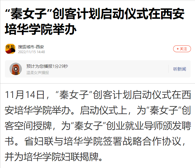 11月14日,“秦女子”创客计划启动仪式在西安培华学院举办。启动仪式上,为“秦女子”创客空间授牌,为“秦女子”创业就业导师颁发聘书。省妇联与培华学院签署战略合作协议,并为培华学院妇联揭牌。