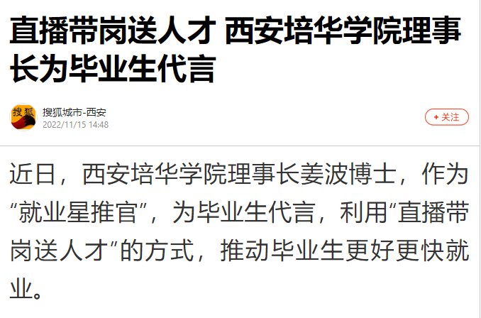 近日,西安培华学院理事长姜波博士,作为“就业星推官”,为毕业生代言,利用“直播带岗送人才”的方式,推动毕业生更好更快就业。