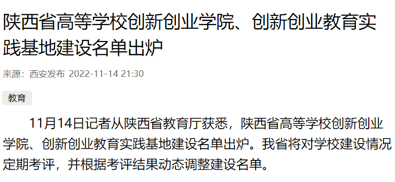 11月14日记者从陕西省教育厅获悉,陕西省高等学校创新创业学院、创新创业教育实践基地建设名单出炉。我省将对学校建设情况定期考评,并根据考评结果动态调整建设名单。