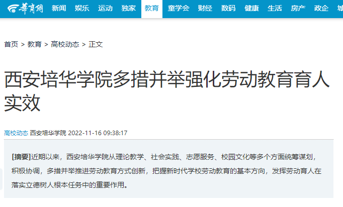 近期以来,西安培华学院从理论教学、社会实践、志愿服务、校园文化等多个方面统筹谋划,积极协调,多措并举推进劳动教育方式创新,把握新时代学校劳动教育的基本方向,发挥劳动育人在落实立德树人根本任务中的重要作用。