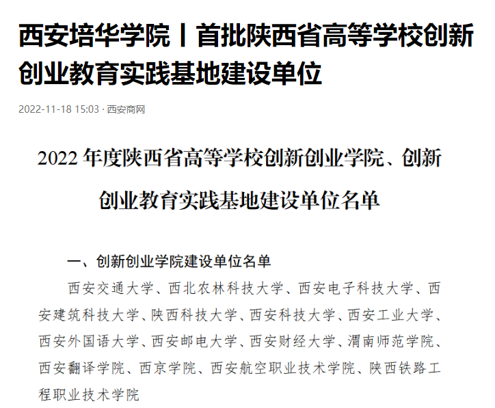近日,陕西省教育厅办公室发布《关于公布陕西省高等学校创新创业学院、创新创业教育实践基地建设名单及考核办法的通知》陕教高办〔2022〕36 号,西安培华学院创客中心通过自主申报,历经材料审查、专家评审及公示阶段,成功入选省级创新创业教育实践基地建设单位名单,取得创新创业平台建设成效的重要突破。