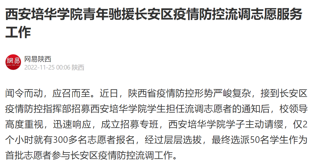 网易新闻:西安培华学院青年驰援长安区疫情防控流调志愿服务工作