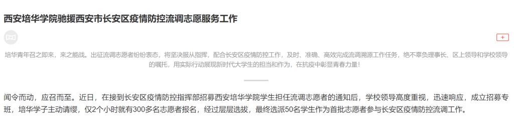 闻令而动,应召而至。近日,陕西省疫情防控形势严峻复杂,接到长安区疫情防控指挥部招募西安培华学院学生担任流调志愿者的通知后,校领导高度重视,迅速响应,成立招募专班,西安培华学院学子主动请缨,仅2个小时就有300多名志愿者报名,经过层层选拔,最终选派50名学生作为首批志愿者参与长安区疫情防控流调工作。