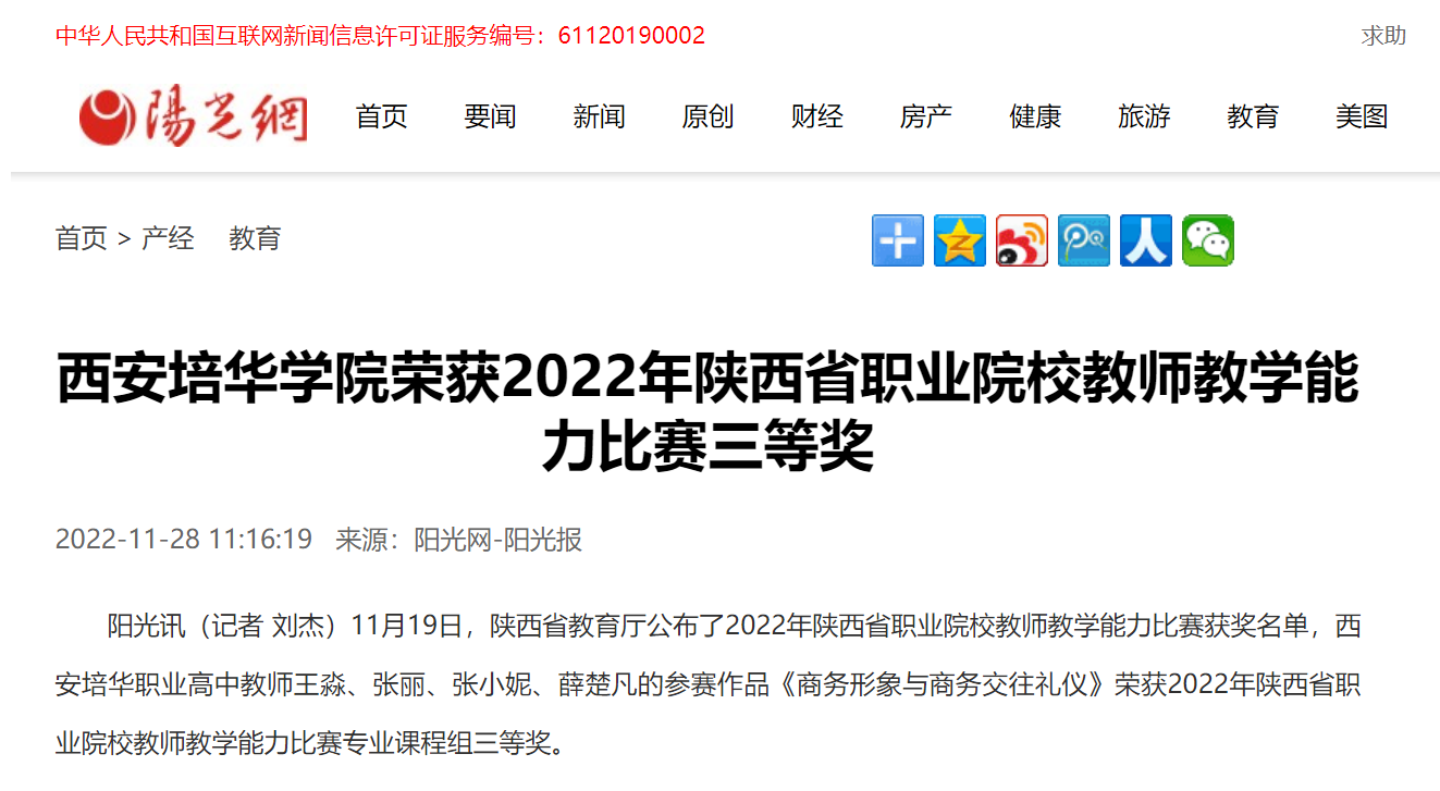 11月19日,陕西省教育厅公布了2022年陕西省职业院校教师教学能力比赛获奖名单,西安培华职业高中教师王淼、张丽、张小妮、薛楚凡的参赛作品《商务形象与商务交往礼仪》荣获2022年陕西省职业院校教师教学能力比赛专业课程组三等奖。