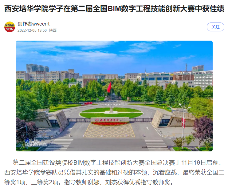 第二届全国建设类院校BIM数字工程技能创新大赛全国总决赛于11月19日启幕。西安培华学院参赛队员凭借其扎实的基础和过硬的本领,沉着应战,最终荣获全国二等奖1项,三等奖2项。指导教师谢娜、刘杰获得优秀指导教师奖。