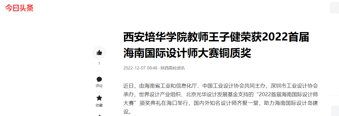 今日头条:西安培华学院教师王子健荣获2022首届海南国际设计师大赛铜质奖