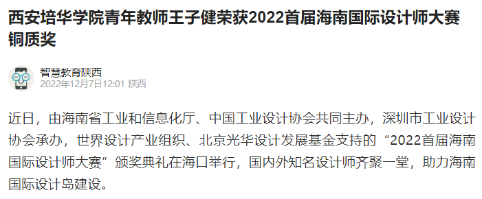 腾讯新闻:西安培华学院教师王子健荣获2022首届海南国际设计师大赛铜质奖