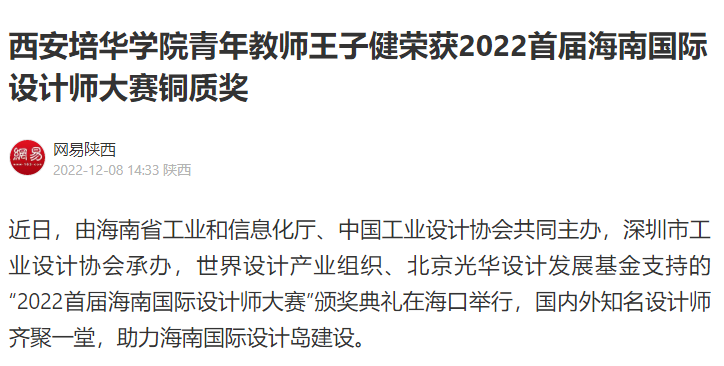 本次获奖体现了国内外设计界和产业界对学校设计专业教师实践能力的赞誉和认可,是西安培华学院打造“双师型”教师队伍的典型案例,有力地展示了学校设计类专业良好的发展态势,有效地提升了学校在设计领域的知名度、美誉度和影响力。