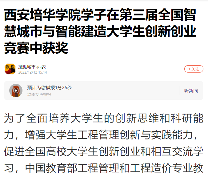 搜狐新闻:西安培华学院学子在智慧城市与智能建造大学生创新创业竞赛中获奖