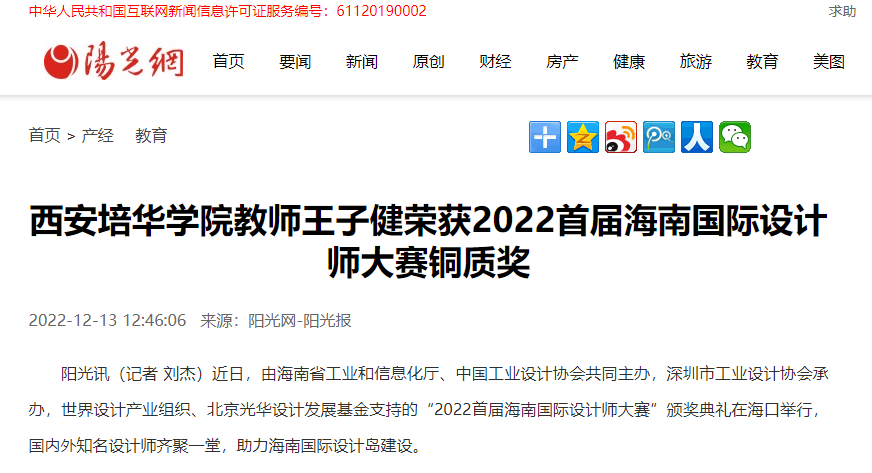 阳光网:西安培华学院教师王子健荣获2022首届海南国际设计师大赛铜质奖