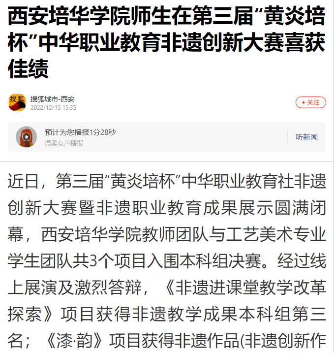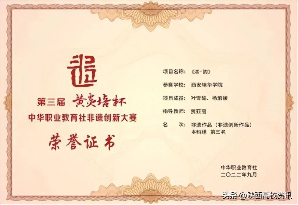 近日,第三届“黄炎培杯”中华职业教育社非遗创新大赛暨非遗职业教育成果展示圆满闭幕,西安培华学院教师团队与工艺美术专业学生团队共3个项目入围本科组决赛。经过线上展演及激烈答辩,《非遗进课堂教学改革探索》项目获得非遗教学成果本科组第三名;《漆·韵》项目获得非遗作品(非遗创新作品)本科组第三名;《耀州印象》项目获得非遗作品(非遗创新作品)本科组优秀奖。