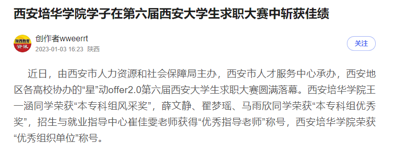 近日,由西安市人力资源和社会保障局主办,西安市人才服务中心承办,西安地区各高校协办的“星”动offer2.0第六届西安大学生求职大赛圆满落幕。西安培华学院王一涵同学荣获“本专科组风采奖”,薛文静、翟梦瑶、马雨欣同学荣获“本专科组优秀奖”,招生与就业指导中心崔佳雯老师获得“优秀指导老师”称号,西安培华学院荣获“优秀组织单位”称号。