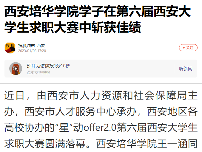 搜狐新闻:西安培华学院学子在第六届西安大学生求职大赛中斩获佳绩