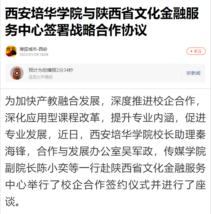 据介绍,西安培华学院与陕西省文化金融服务中心达成友好战略合作,双方将抓住此次契机,打造产教融合命运共同体,为陕西文化事业和文化产业发展持续赋能。