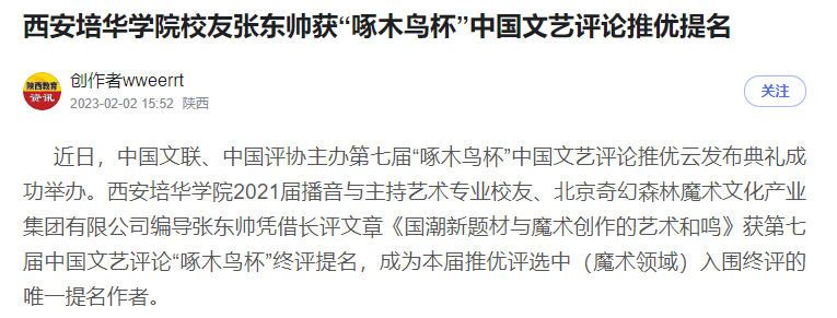 近日,中国文联、中国评协主办第七届“啄木鸟杯”中国文艺评论推优云发布典礼成功举办。西安培华学院2021届播音与主持艺术专业校友、北京奇幻森林魔术文化产业集团有限公司编导张东帅凭借长评文章《国潮新题材与魔术创作的艺术和鸣》获第七届中国文艺评论“啄木鸟杯”终评提名,成为本届推优评选中(魔术领域)入围终评的唯一提名作者。