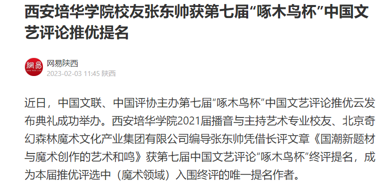 近日,中国文联、中国评协主办第七届“啄木鸟杯”中国文艺评论推优云发布典礼成功举办。西安培华学院2021届播音与主持艺术专业校友、北京奇幻森林魔术文化产业集团有限公司编导张东帅凭借长评文章《国潮新题材与魔术创作的艺术和鸣》获第七届中国文艺评论“啄木鸟杯”终评提名,成为本届推优评选中(魔术领域)入围终评的唯一提名作者。