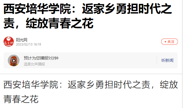 阳光讯(记者 刘杰)在西安培华学院的校园里有这样一群大学生他们暂别舒适的生活带着青年人特有的青春与活力回到家乡,走向社会根植沃土,砥砺实践他们怀揣家国情怀,投身家乡建设。他们就是参加2023年返家乡社会实践活动的培华青年们,将小我融入大我,他们把青春献给家乡。寒假生活即将结束小伙伴们快把小板凳准备好来听听他们精彩的实践故事吧!