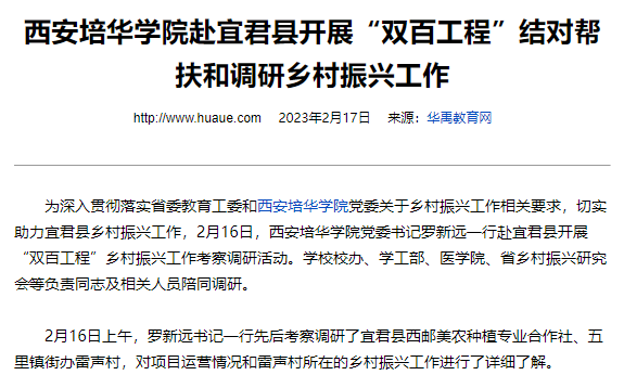 华禹教育网:西安培华学院赴宜君县开展“双百工程”结对帮扶和调研乡村振兴工作