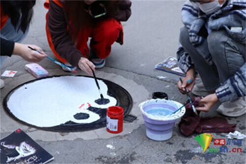 建筑与艺术设计学院的志愿者利用所学专业知识,手拿彩绘工具,以井盖为画布,认真勾勒图案,给灰突突的井盖穿上了“新衣”,让原本沉寂的沥青道路增添了不少生机与活力。