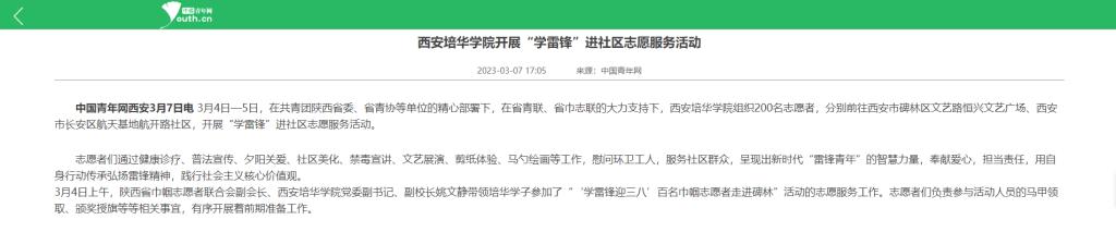 近年来,西安培华学院始终把青年志愿者行动摆在学校发展的工作大局中进行谋划和推进,以“实践育人”为切入点,不断拓宽志愿服务领域,形成覆盖广泛、内容丰富、具有较高专业水准的志愿服务项目体系。新的一年,该校将继续推动青年志愿服务工作实现创新突破,为谱写学校高水平一流民办大学发展建设新篇章贡献青春力量。(霍元敏)