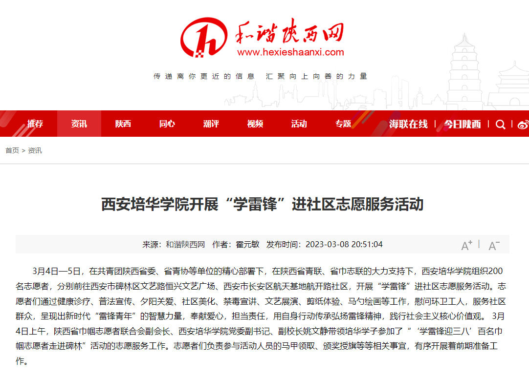 今年是毛泽东等老一辈革命家为雷锋同志题词60周年,3月5日是第24个“中国青年志愿者服务日”。西安培华学院积极响应号召,2023年3月4日-5日,在团省委、省青协等单位的精心部署下,在省青联、省巾志联的大力支持下,校妇联、党委学工部、党委宣传部、校团委联合各二级学院团委(团总支)、各学生组织的200名志愿者,分别前往碑林区文艺路恒兴文艺广场、长安区航天基地航开路社区,开展“学雷锋”进社区志愿服务活动。志愿者们通过健康诊疗、普法宣传、夕阳关爱、社区美化、禁毒宣讲、文艺展演、剪纸体验、马勺绘画等工作,慰问环卫工人,服务社区群众,呈现出新时代“雷锋青年”的智慧力量,奉献爱心,担当责任,用自身行动传承弘扬雷锋精神,践行社会主义核心价值观。