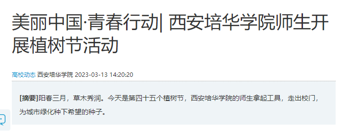 阳春三月,草木秀润。今天是第四十五个植树节,西安培华学院的师生拿起工具,走出校门,为城市绿化种下希望的种子。