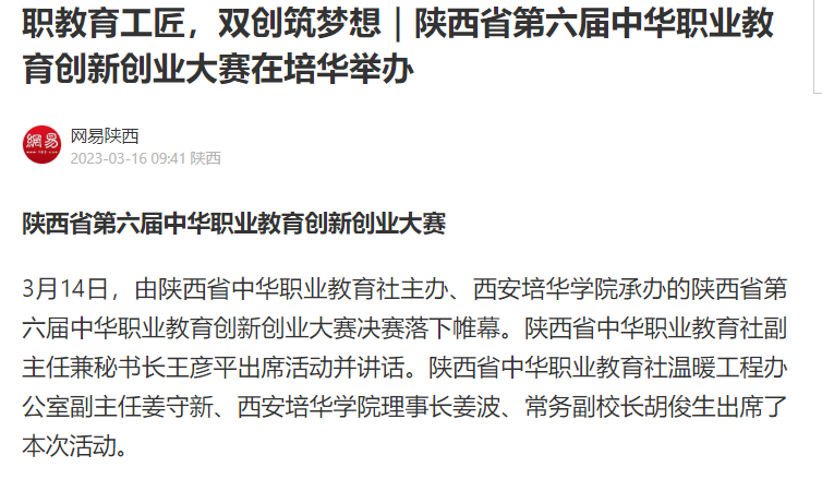 网易新闻:职教育工匠,双创筑梦想|陕西省第六届中华职业教育创新创业大赛在培华举办