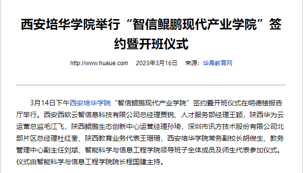 华禹教育网:西安培华学院举行“智信鲲鹏现代产业学院”签约暨开班仪式