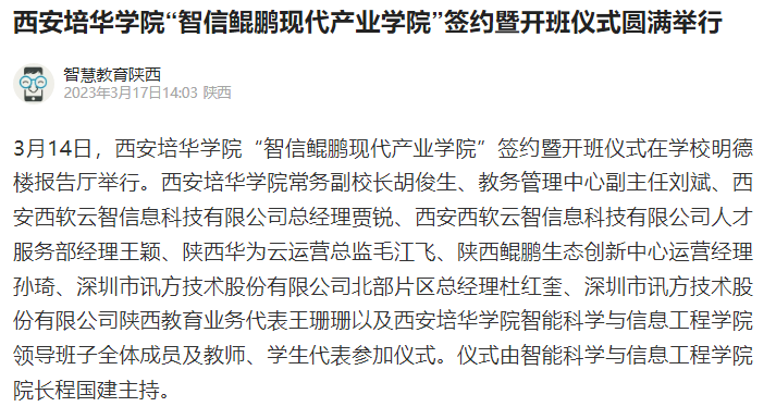 腾讯新闻:西安培华学院“智信鲲鹏现代产业学院”签约暨开班仪式圆满举行