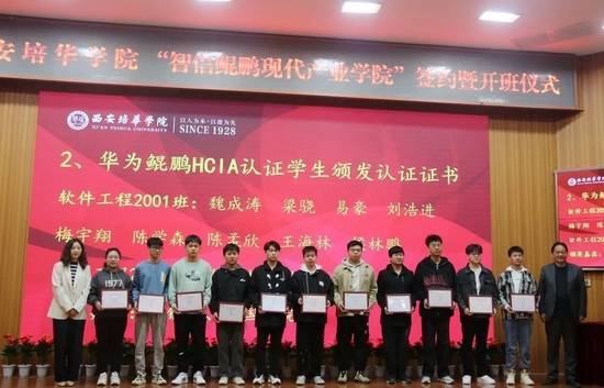 开班仪式上,西安西软云智信息科技有限公司总经理贾锐、培华智能科学与信息工程学院院长程国建还为取得华为鲲鹏HCIA认证的学生颁发了认证证书。