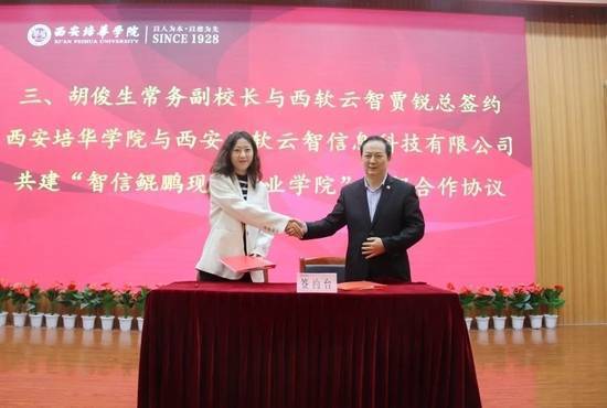 在签约仪式上,西安培华学院常务副校长胡俊生与西软云总经理智贾锐分别代表校企双方签署《西安培华学院与西安西软云智信息科技有限公司共建“智信鲲鹏现代产业学院”框架合作协议》。
