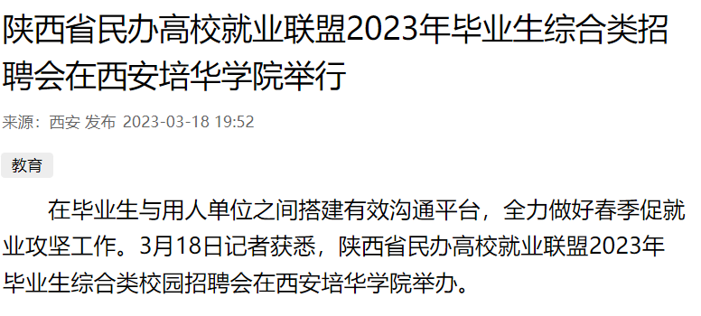 在毕业生与用人单位之间搭建有效沟通平台,全力做好春季促就业攻坚工作。3月18日记者获悉,陕西省民办高校就业联盟2023年毕业生综合类校园招聘会在西安培华学院举办。