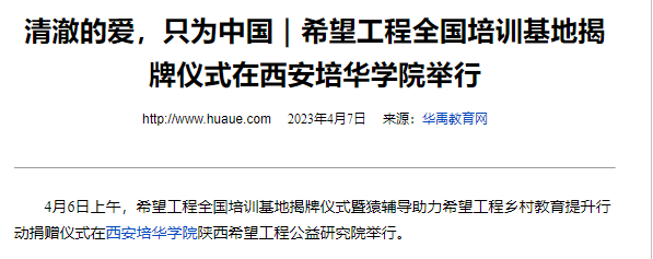 此次挂牌的希望工程全国培训基地坐落于西安培华学院陕西希望工程公益研究院。2020年11月20日,为深入学习贯彻落实习近平总书记对希望工程寄语精神,推动新时代陕西希望工程事业发展,团省委、省青基会联合西安培华学院成立了西安培华学院陕西希望工程公益研究院,通过公益研究院的组织和平台建设,促进陕西希望工程在聚焦定位、战略转型、提档升级和制度治理等方面实现质的飞跃。挂牌希望工程全国培训基地后,这里将成为希望工程助力青少年公益事业健康发展的助推器、凝聚爱心力量服务青少年成长发展的桥头堡、宣传弘扬新时代希望工程精神内涵的大平台。