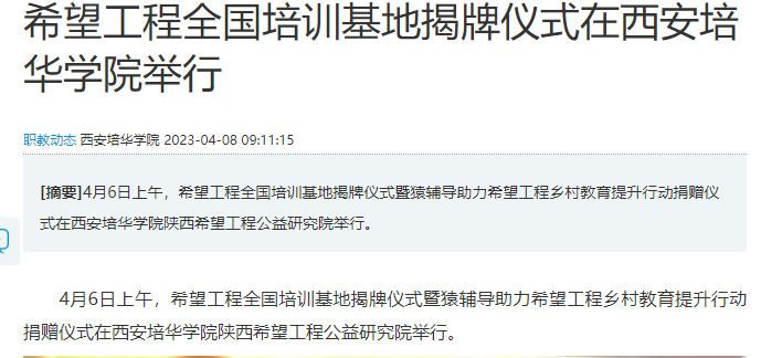 华商网:希望工程全国培训基地揭牌仪式在西安培华学院举行