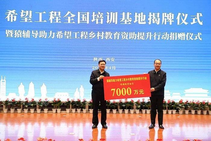 中国青少年发展基金会党委书记、理事长郭美荐代表中国青少年发展基金会向陕西希望工程赠送价值7000万元的教育提升配套物资,共青团陕西省委书记、省青联主席徐永胜代表陕西希望工程接受捐赠。