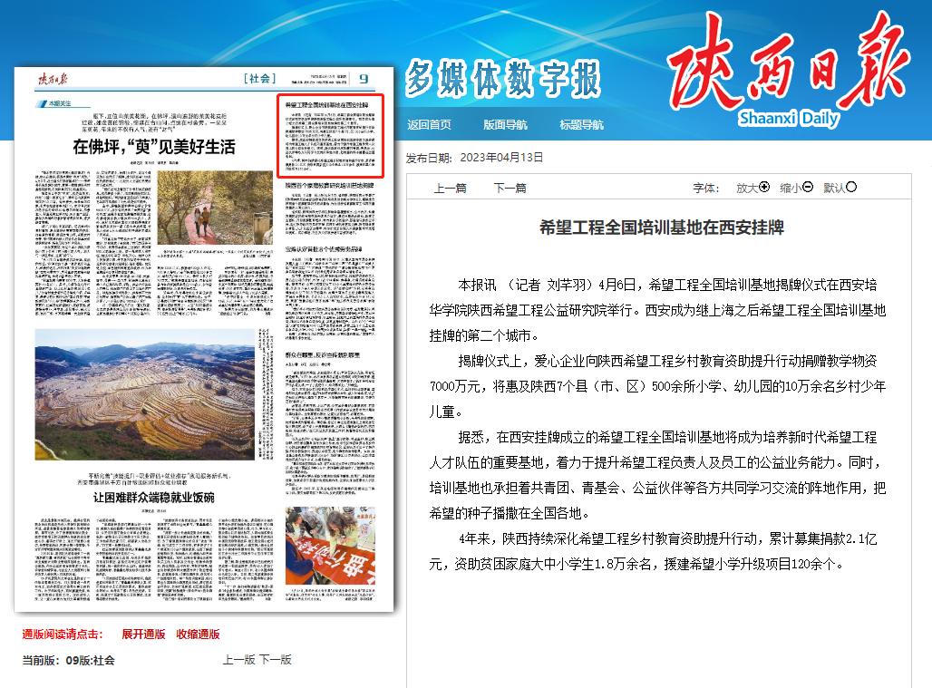 本报讯 (记者 刘芊羽)4月6日,希望工程全国培训基地揭牌仪式在西安培华学院陕西希望工程公益研究院举行。西安成为继上海之后希望工程全国培训基地挂牌的第二个城市。
