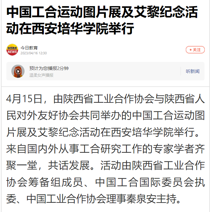 4月15日,由陕西省工业合作协会与陕西省人民对外友好协会共同举办的中国工合运动图片展及艾黎纪念活动在西安培华学院举行。来自国内外从事工合研究工作的专家学者齐聚一堂,共话发展。活动由陕西省工业合作协会筹备组成员、中国工合国际委员会执委、中国工业合作协会理事秦泉安主持。
