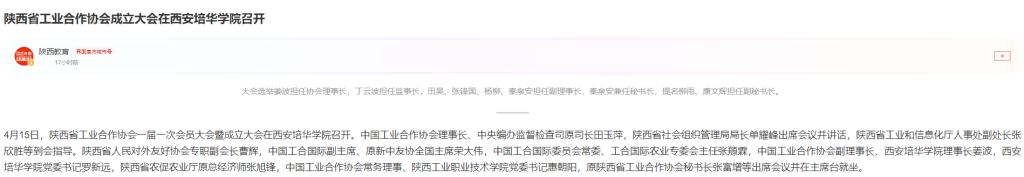 4月15日,陕西省工业合作协会一届一次会员大会暨成立大会在西安培华学院召开。中国工业合作协会理事长、中央编办监督检查司原司长田玉萍,陕西省社会组织管理局局长单耀峰出席会议并讲话,陕西省工业和信息化厅人事处副处长张欣胜等到会指导。陕西省人民对外友好协会专职副会长曹辉,中国工合国际副主席、原新中友协全国主席荣大伟,中国工合国际委员会常委、工合国际农业专委会主任张羱霖,中国工业合作协会副理事长、西安培华学院理事长姜波,西安培华学院党委书记罗新远,陕西省农促农业厅原总经济师张旭锋,中国工业合作协会常务理事、陕西工业职业技术学院党委书记惠朝阳,原陕西省工业合作协会秘书长张富增等出席会议并在主席台就坐。