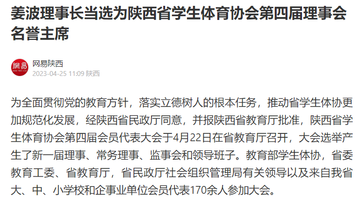 姜波理事长当选为陕西省学生体育协会第四届理事会名誉主席