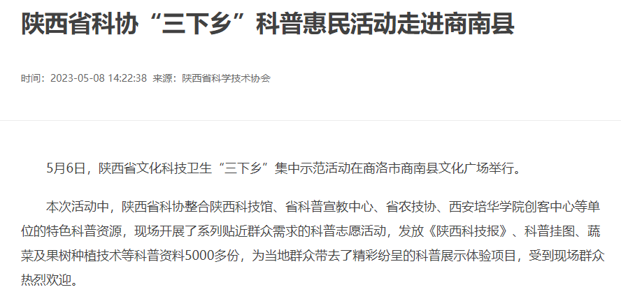近年来,陕西省科协把开展“三下乡”“科技之春”宣传月、全国科普日等品牌科普活动作为服务基层、服务“三农”的有力抓手和具体举措,以提升农民和农村青少年科学素质为重点,依托新时代文明中心、科技小院、农技协、农村科普大学等资源,充分发挥科技志愿者集中服务作用,把“送”与“需”“送”与“用”结合起来,面向农村积极开展“十团服务百村示范千人下乡”“百人专家团 万人大培训”等科技服务活动,提升农技人员、种养殖大户和生产人员科技素质,推广先进实用科学技术,助推产业提质增效和农民增收。大力开展科普大篷车进校园、“流动科技馆”巡展等科普实践活动,助力“双减”,提高农村青少年追求科学梦想、探索科学的实践能力。