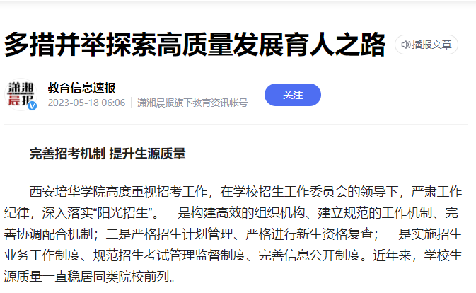 西安培华学院高度重视招考工作,在学校招生工作委员会的领导下,严肃工作纪律,深入落实“阳光招生”。一是构建高效的组织机构、建立规范的工作机制、完善协调配合机制;二是严格招生计划管理、严格进行新生资格复查;三是实施招生业务工作制度、规范招生考试管理监督制度、完善信息公开制度。近年来,学校生源质量一直稳居同类院校前列。