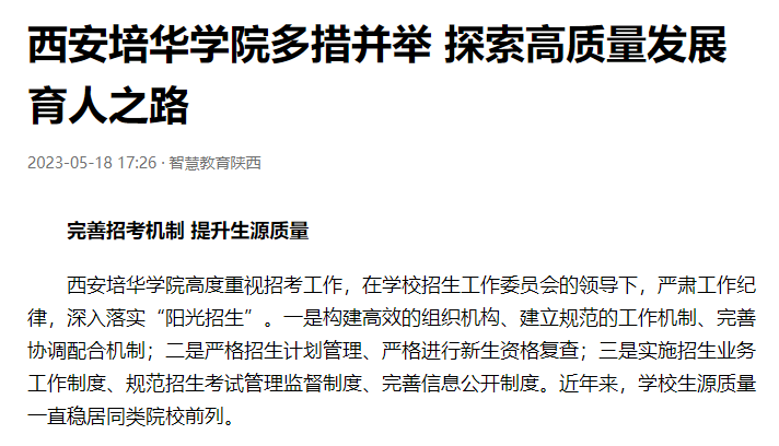 西安培华学院高度重视招考工作,在学校招生工作委员会的领导下,严肃工作纪律,深入落实“阳光招生”。一是构建高效的组织机构、建立规范的工作机制、完善协调配合机制;二是严格招生计划管理、严格进行新生资格复查;三是实施招生业务工作制度、规范招生考试管理监督制度、完善信息公开制度。近年来,学校生源质量一直稳居同类院校前列。