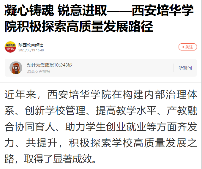 近年来,西安培华学院在构建内部治理体系、创新学校管理、提高教学水平、产教融合协同育人、助力学生创业就业等方面齐发力、共提升,积极探索学校高质量发展之路,取得了显著成效。