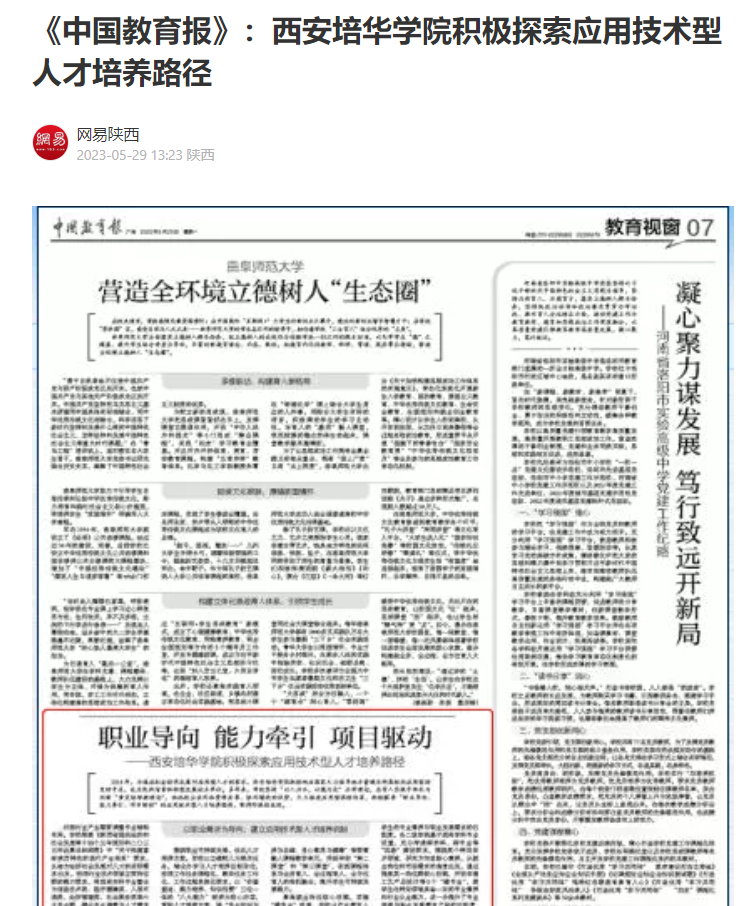 2014年,为适应社会经济发展对应用型人才的需求,西安培华学院积极响应国家大力倡导地方普通本科高校向应用型转变的号召,成为陕西省首批转型发展试点单位。多年来,学校坚持“以人为本,以德为先”办学理念,在育人实践中传承与创新“黄炎培职教理念”,依托校企共同体资源共享、协同增效的优势,大力推进应用型课程改革,积极探索“职业导向、能力牵引、项目驱动”的应用技术型人才培养路径,取得阶段性成效。
